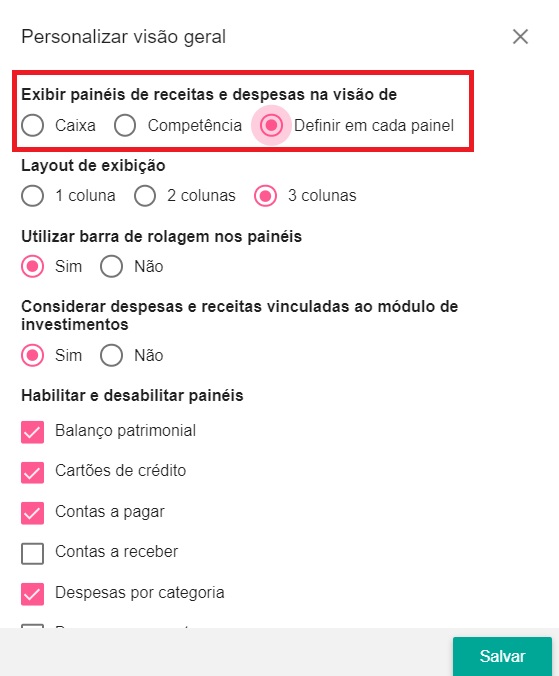 Habilitar a visão de caixa/competência por painel na visão geral