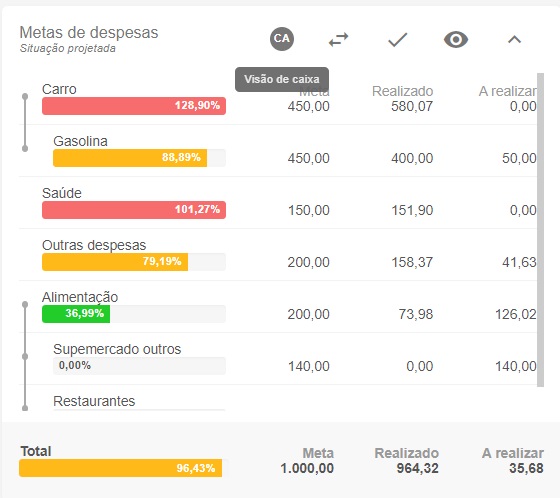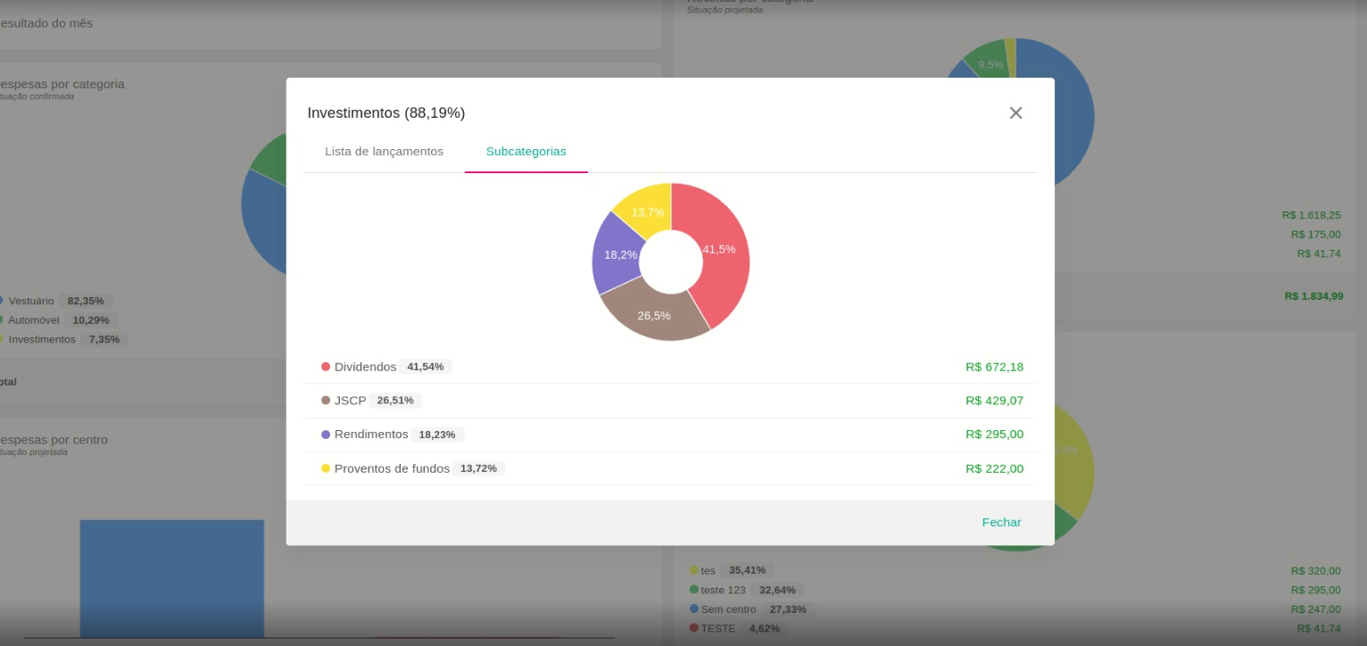 Adicionamos aos painéis de Despesas e Receitas por Centro/Categoria da Visão Geral, a porcentagem dos valores discriminados. A informação de porcentagem de participação também foi adicionado na visualização detalhada da Categoria/Centro.