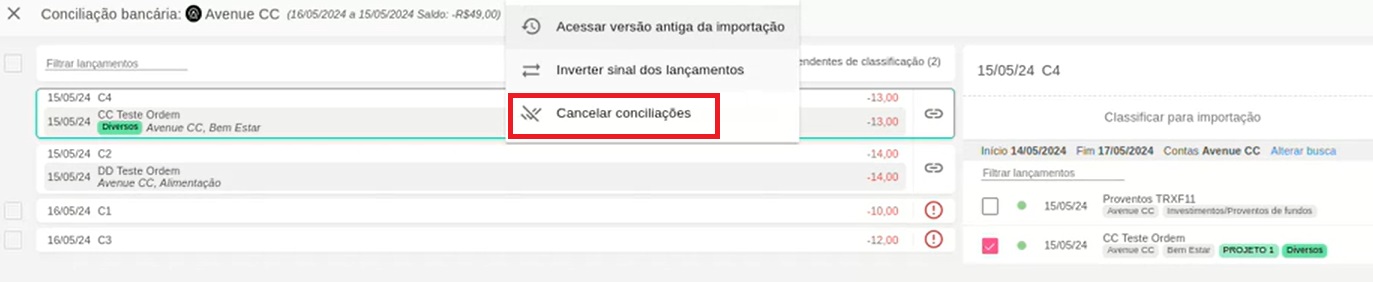 Opção de cancelar as conciliações realizadas