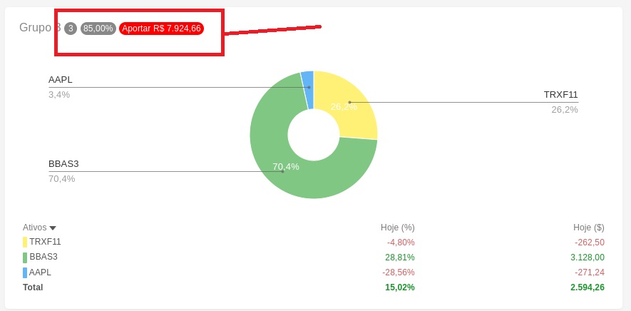 Agora é possível definir um valor de meta absoluta para um grupo da estratégia de alocação. Repare também que o sistema exibe o valor que você deveria aportar ou resgatar/realocar. Este recurso de estratégia está cada vez mais incrível. Se você ainda não utiliza, está marcando bobeira =)