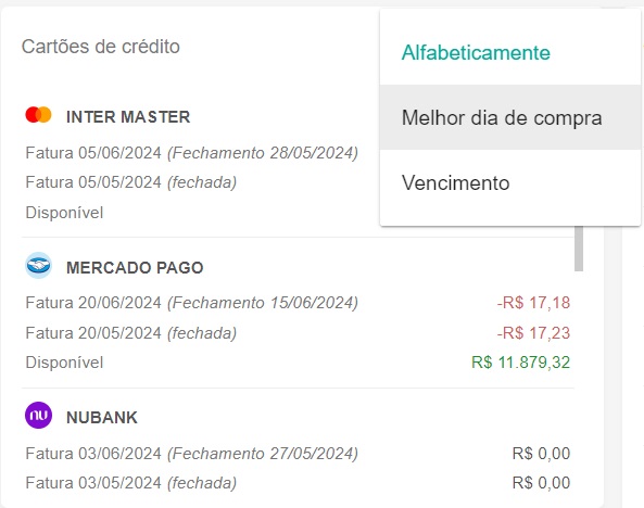 Nova opção de ordenação de Cartões de Crédito na Visão Geral