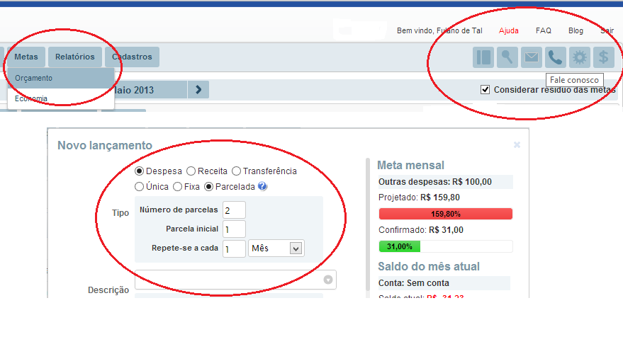 b) Lançar direto no Meu Dinheiro pela tela de inclusão de lançamentos. Neste caso você pode aproveitar também para definir uma meta de mensal para os principais gastos;