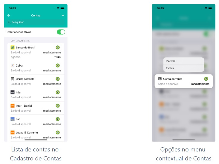 *Para acessar o menu contextual, que permite inativar/excluir o item diretamente da lista, é só tocar e pressionar o item.