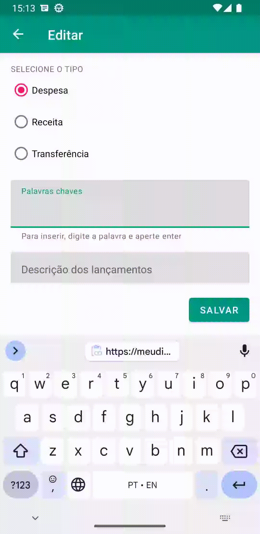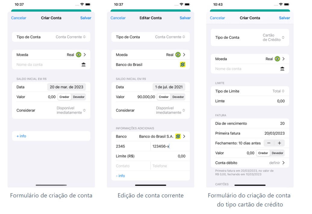 Reformulamos a tela de Cadastro de Contas, aplicando um layout mais “nativo” e “responsivo”. O novo formulário se comporta de forma semelhante a web e ao layout do app Android. Dentro do formulário é possível alterar o tipo de Conta que está sendo criada/editada e selecionar a moeda da conta que está sendo criada. Para contas do tipo Cartão de Crédito o gerenciamento de cartões (plásticos) pode ser feito dentro do mesmo formulário.