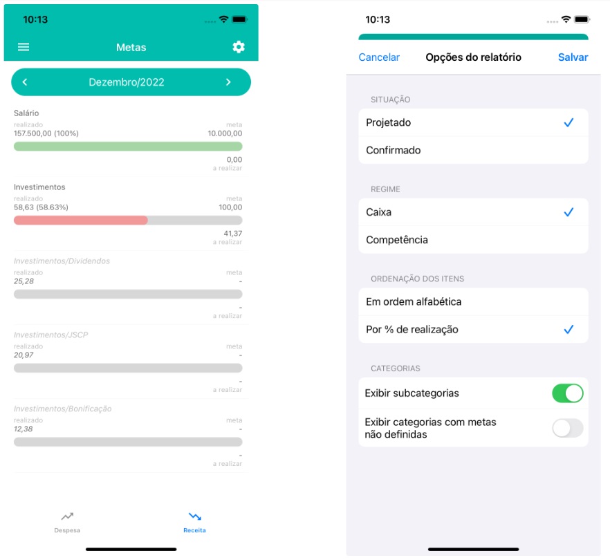 No relatório de Metas foram adicionados novos filtros para visualização do relatório assim como no Android. Os filtros incluem as propriedades de situação confirmada/projetada, regime de caixa/competência, ordenação dos itens, exibição de subcategorias e exibição de categorias com metas não definidas. Para acessar esse menu, basta tocar no ícone de configurações (⚙️), na barra de topo, no canto superior direito.