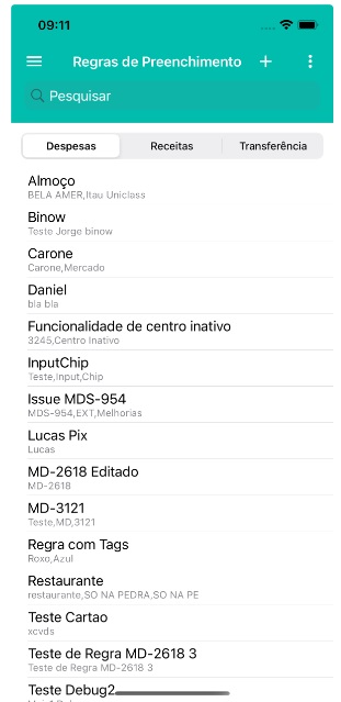 Melhoramos a tela de Regras de Preenchimento. Adicionamos campo de pesquisa na barra de topo, assim fica mais fácil encontrar as regras na lista. Liberamos também a opção de filtrar regras com status ativo e inativo (As demais telas de cadastro também contam com esta melhoria). Para acessar basta tocar no botão de VER MAIS (no canto direito da barra de topo). Por último, criamos um seletor por tipo de regra de preenchimento. Todas as três características se somam durante a pesquisa e exibição dos itens.