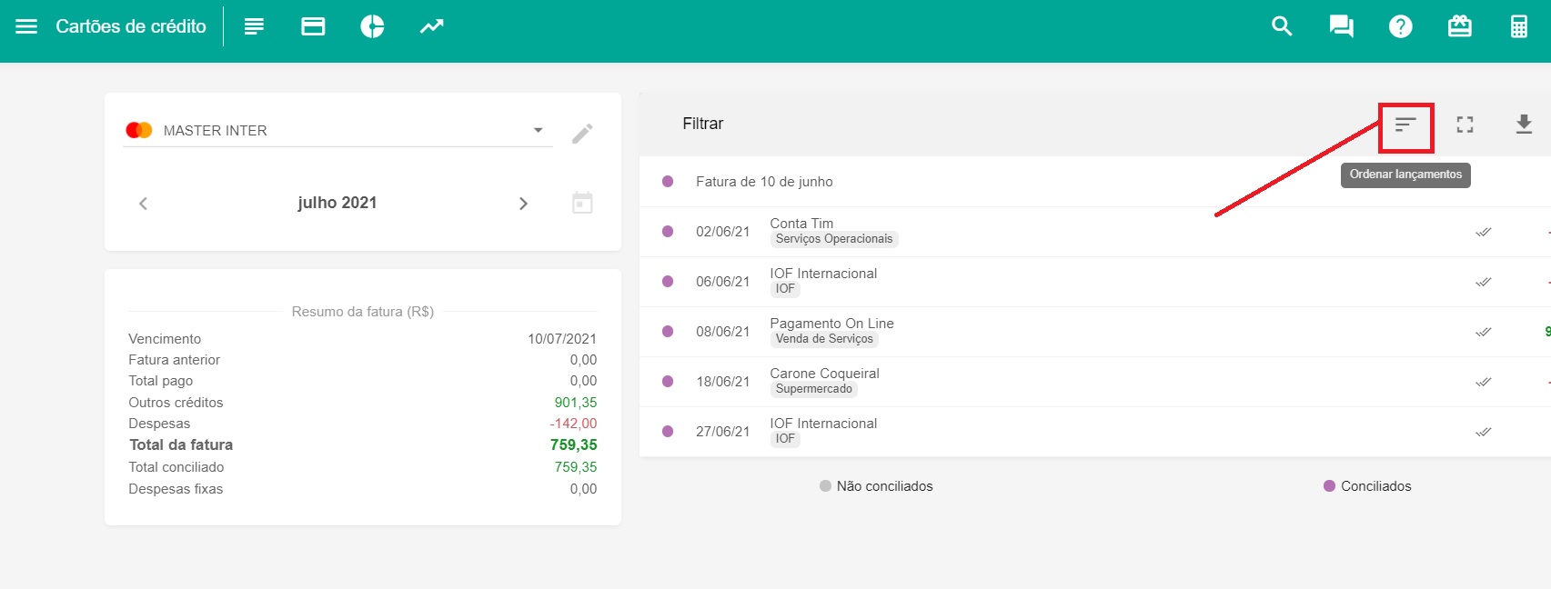 Ainda sobre a tela Cartão de Crédito, agora é possível exportar os lançamentos da fatura, basta clicar no ícone de exportação no canto superior direito da tela.