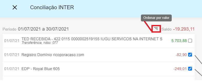 Uma das solicitações de melhoria na tela de conciliação, que recebemos e disponibilizamos, foi permitir a ordenação da lista de registros pelo valor, conforme destacado na imagem acima. A partir de agora, no momento da conciliação, o sistema também importa informações para o campo de observações e atualiza dados de cadastros como categorias, contatos, projetos, centros e número de documento.