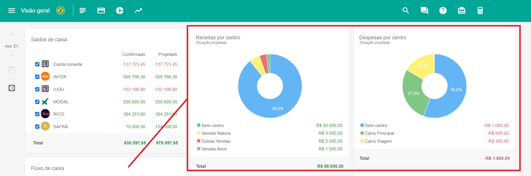 A tela de Visão Geral agora também conta com painéis de receitas e despesas por centros.