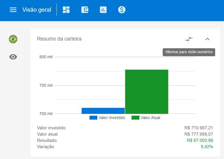 Na tela de visão geral do controle de investimentos agora é possível alterar o painel de Resumo da Carteira para uma visão gráfica. Basta passar o mouse sobre a parte superior do painel e alterar o modo de visualização.