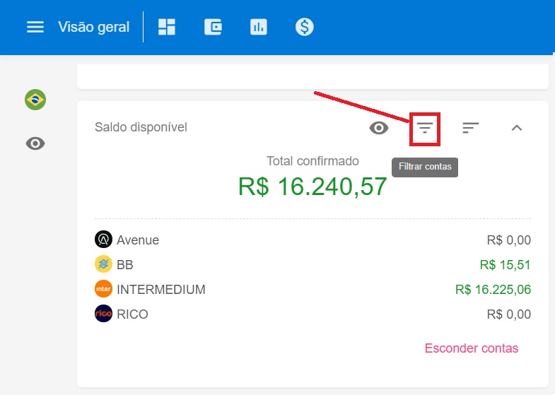 Agora é possível escolher as contas que devem ser consideradas no painel de Saldo Disponível do controle de investimentos.