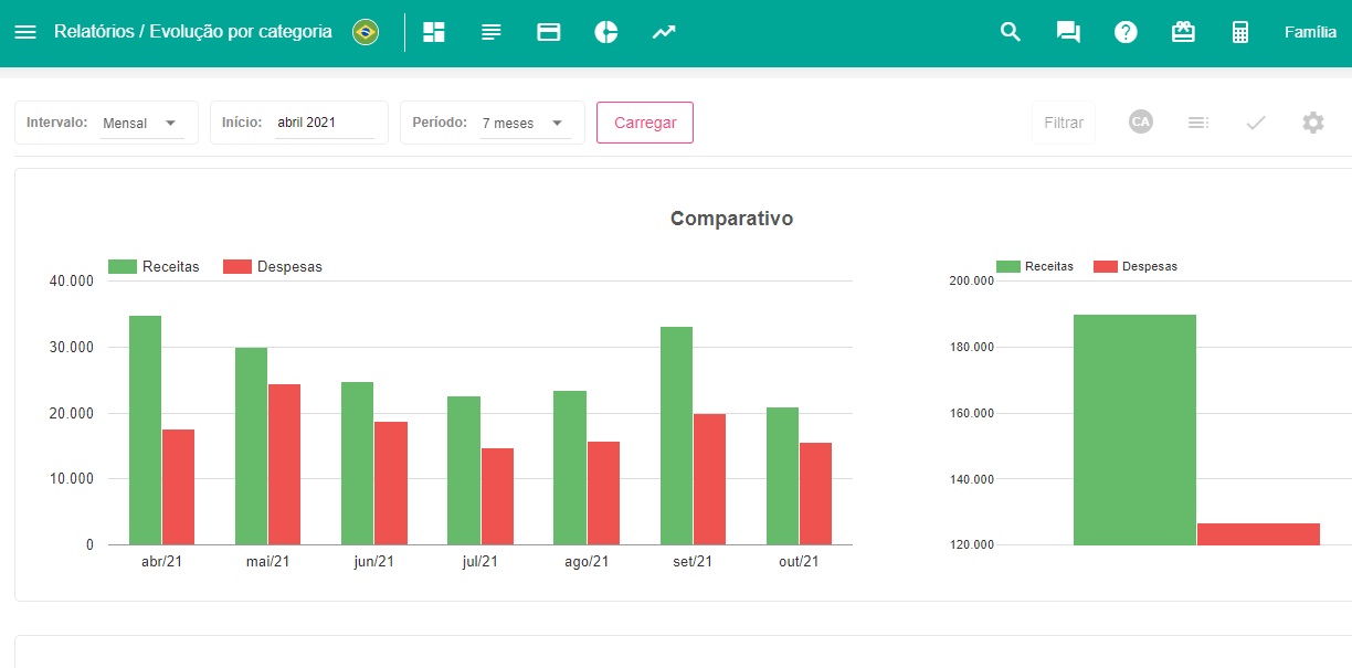 Sabem o relatório de Evolução por Categoria? Então, agora ele ganhou uma visão gráfica muito legal. Conforme podem visualizar na imagem abaixo, as informações nesta versão gráfica certamente irão ajudar bastante na hora de realizar uma análise mais ágil e visual da evolução das suas despesas e receitas.