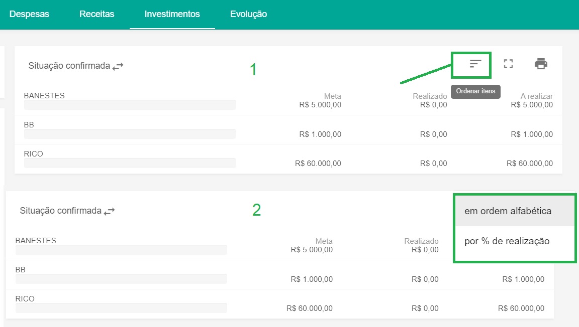 A próxima melhoria disponibilizada foi a de ordenação das metas de investimentos por ordem alfabética. Assim como a primeira melhoria, essa também foi implementada através de um pedido registrado via chamado pelo nosso querido Diógenes Ferrosil.