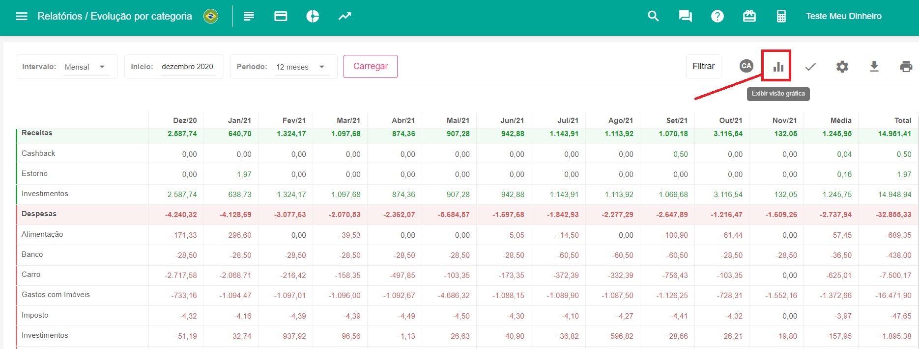 Para acessar a visão gráfica é bem simples. Basta clicar no ícone destacado na imagem abaixo. Para acessar o relatório, menu principal->Relatórios->Evolução por Categoria.