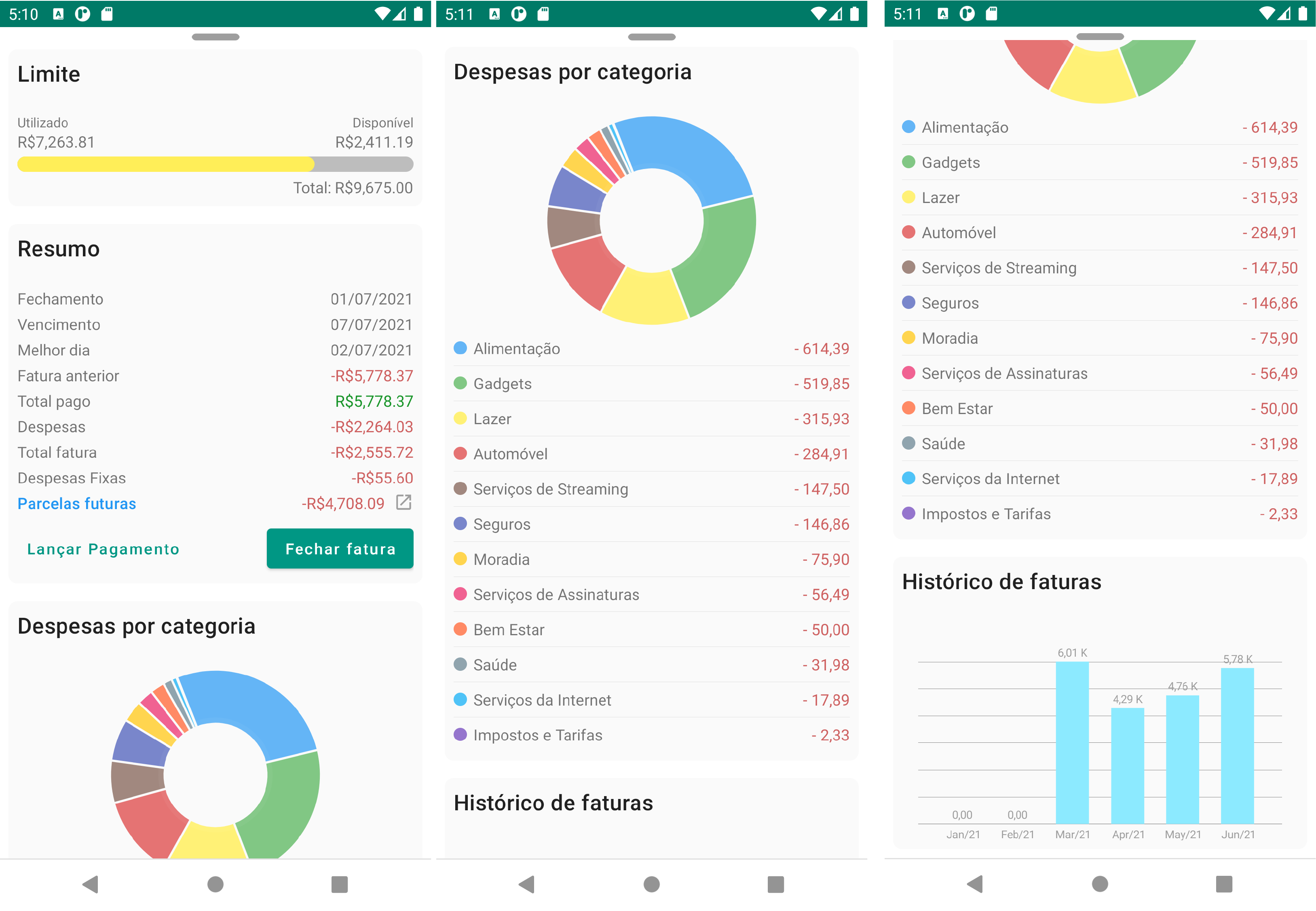 - Resumo (detalhado, assim como na web) com a possibilidade de fechar a fatura/lançar pagamento;