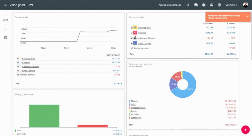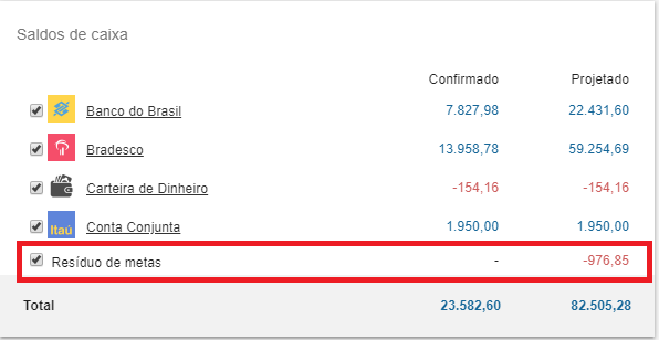 Considerando que você gastou R$900,00 na categoria carro e R$0,00 em alimentação, o painel de saldos irá considerar como resíduo, R$800,00, pois a sua meta de carro já foi extrapolada mas de acordo com as metas definidas você ainda pode ter um gasto de R$800,00 com alimentação.