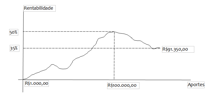 Por exemplo, imaginemos um investidor que inicie com um aporte de apenas R$ 1.000,00 e que durante um longo período tenha uma rentabilidade muito boa. Digamos que em seis meses ele tenha conseguido 50% de ganho. Como ele está satisfeito com o desempenho, resolve aportar um valor bem mais significativo, por exemplo, R$ 100.000,00. Imaginemos que, a partir desse novo aporte, a rentabilidade comece a cair, e ceda 10%.