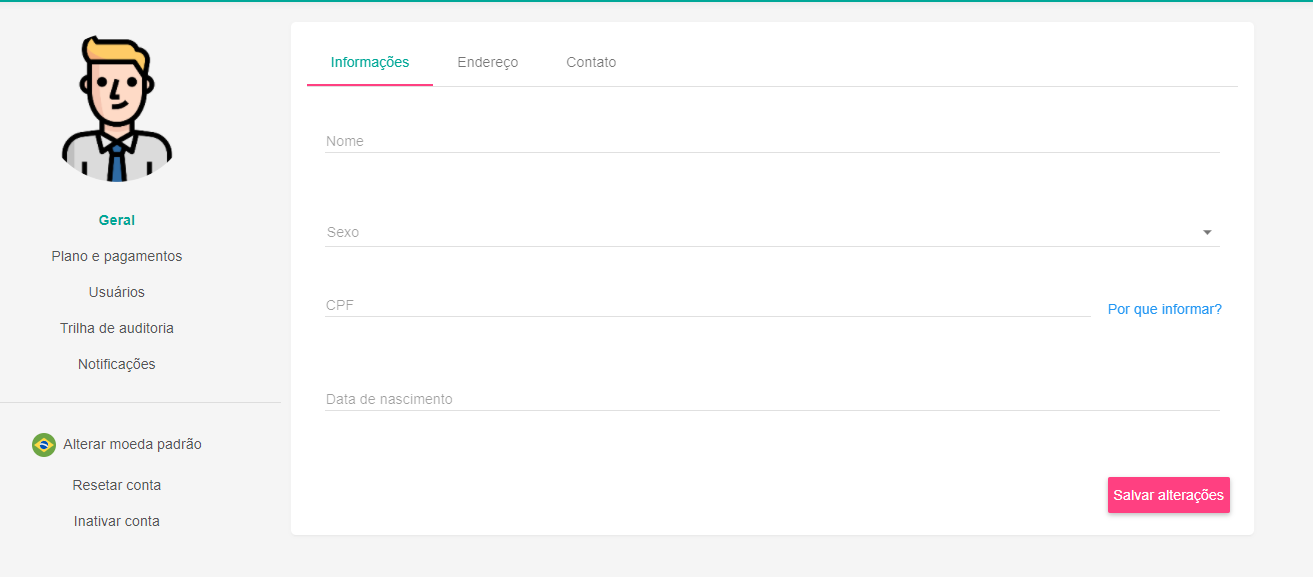 Tela que dá início ao “Configuração de conta e plano”, inicialmente as informações mais importantes são: seu nome, ou nome da empresa em caso de conta empresarial, CPF/CNPJ e endereço. Vale ressaltar que o CPF é utilizado para emissão da nota fiscal quando você realiza um pagamento no Meu Dinheiro. A prefeitura em que nossa empresa está cadastrada exige CPF/CNPJ e endereço para emissão da nota fiscal. As outras informações complementares podem ser preenchidas de acordo com a necessidade e interesse de cada usuário. É daí que o sistema puxa os dados automaticamente para utilização de recursos como emissão de recibos e propostas comerciais, por exemplo.