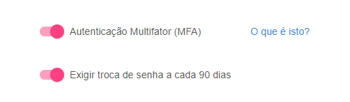 Na aba inicial de dados de acesso você pode alterar o nome, email e senha da conta e também pode encontrar os novos recursos de segurança como: autenticação multifator e habilitar a exigência de troca de senha a cada 90 dias.