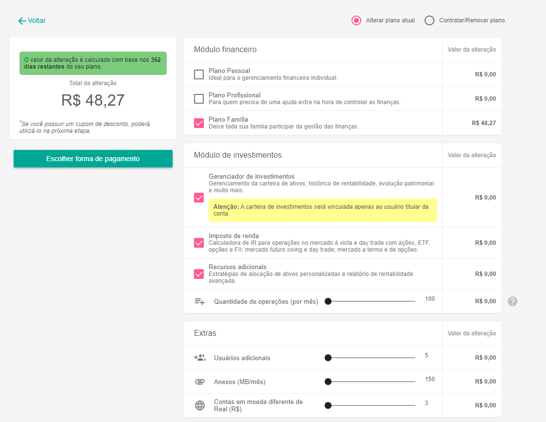 Ps: A tela de alteração/upgrade de plano é muito bacana pois permite que você simule o valor do upgrade de acordo com os novos recursos que você pretende contratar para complementar o seu controle. Parece algo bobo, mas é uma dúvida que vira e mexe aparece em nossos canais de suporte. Lembrando que ao fazer um upgrade você paga apenas pela diferença de recursos do seu plano atual e o novo plano.