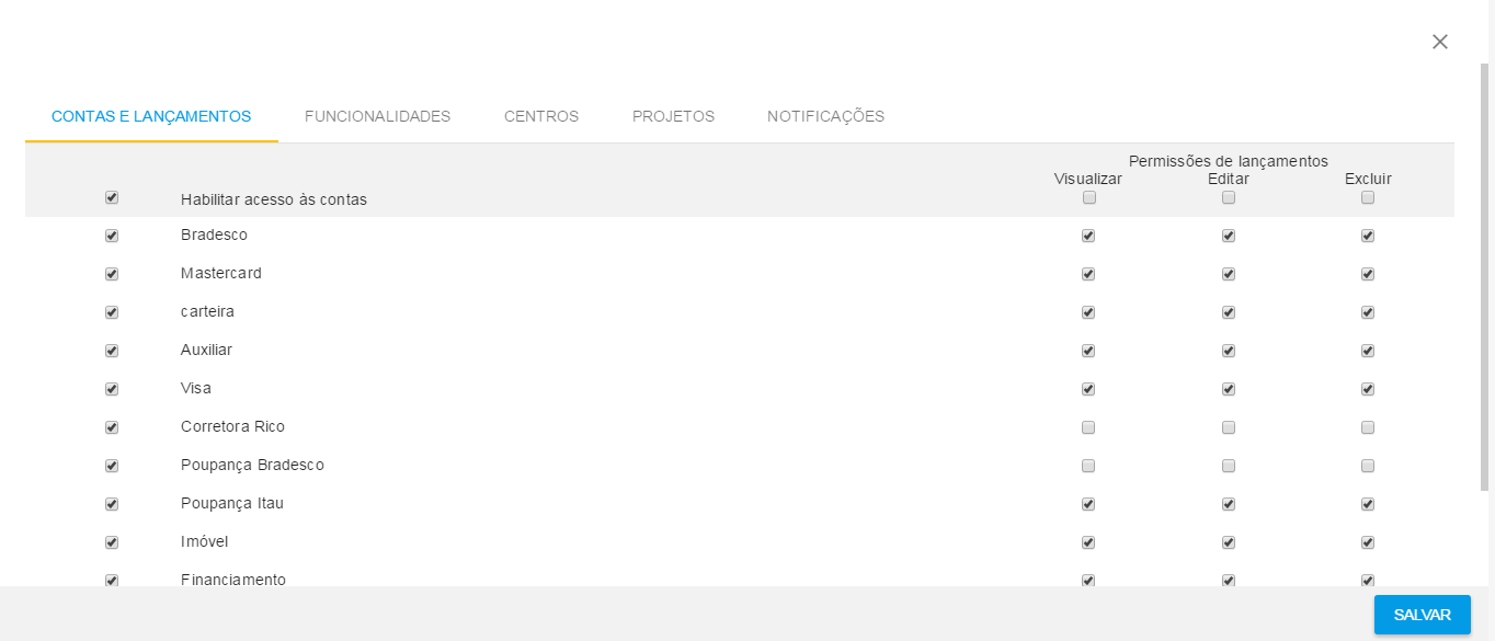 - Indicar as contas as quais o usuário tem acesso, bem como que tipo de ação sobre os lançamentos da conta o mesmo pode executar;
