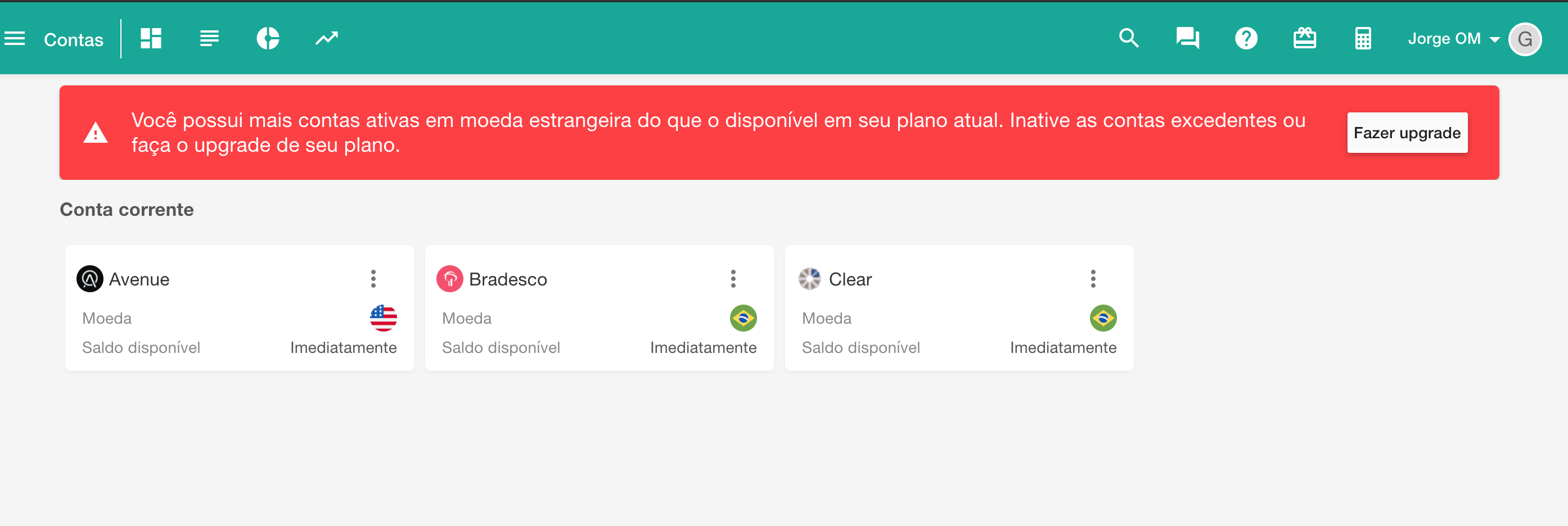 Dependendo da opção que você escolher pode ser necessário contratar um novo plano ou fazer um upgrade da quantidade de contas diferentes da moeda padrão de sistema que você pode cadastrar. O sistema permite cadastrar em quantidade ilimitada contas e cartões da moeda escolhida como padrão de sistema. Moedas diferentes da selecionada como padrão de sistema exigem plano superior ou upgrade deste recurso no plano atual.