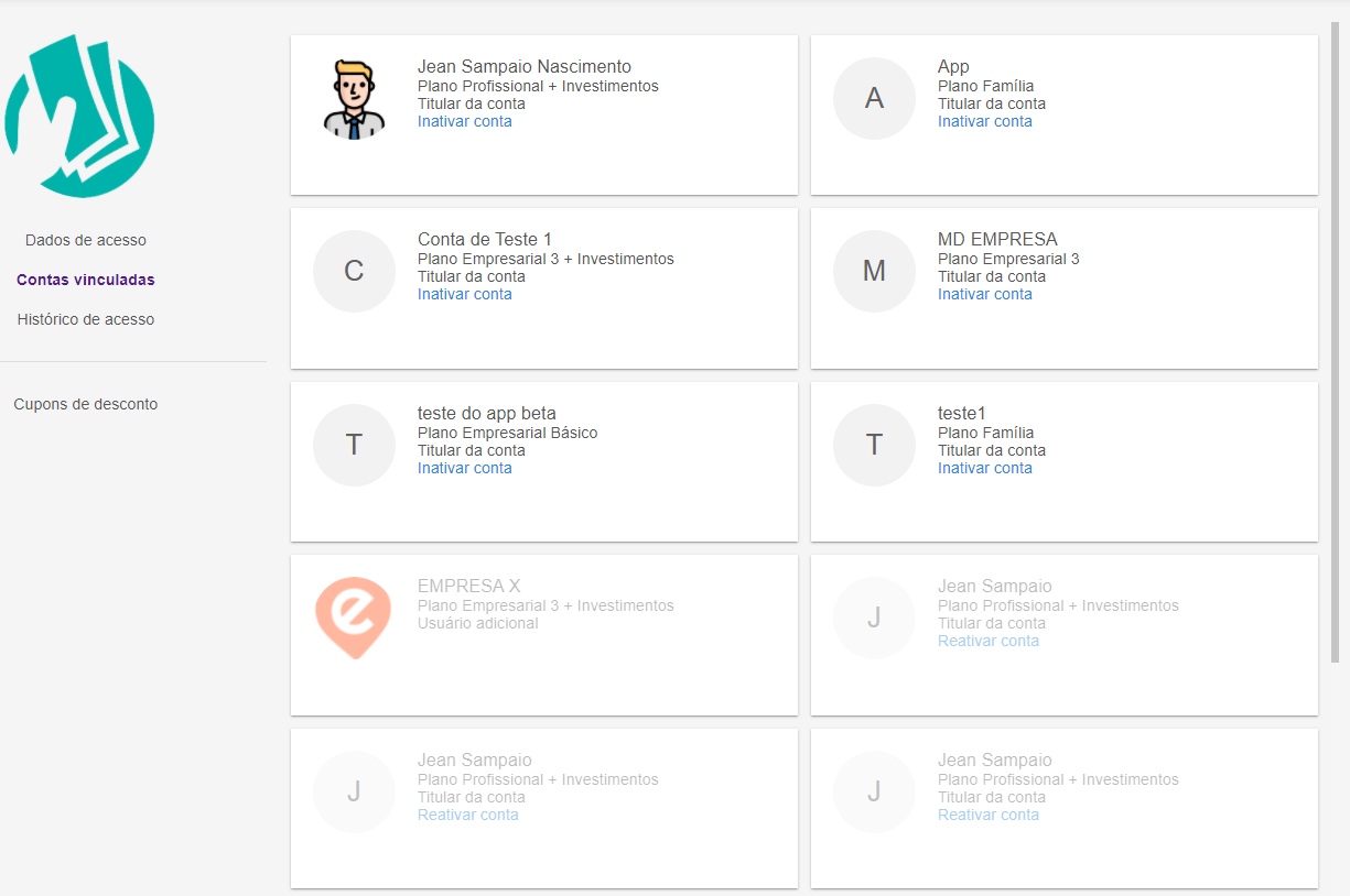 O “contas vinculadas” permite a visualização de todas as contas no qual o seu login/email está vinculado. Por exemplo: se você utiliza o seu login para conta pessoal e também para sua conta empresarial, você vai encontrar as duas contas nesta tela. Existe a opção de inativar a conta por esta tela também.