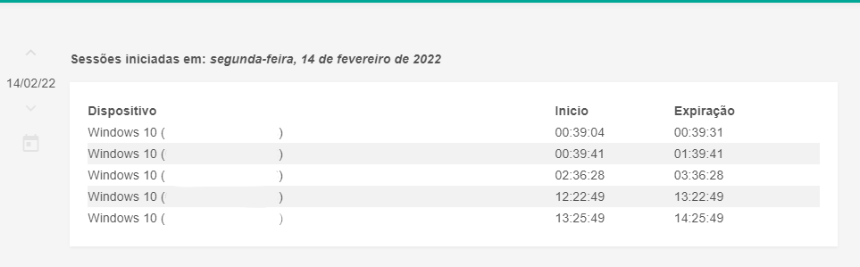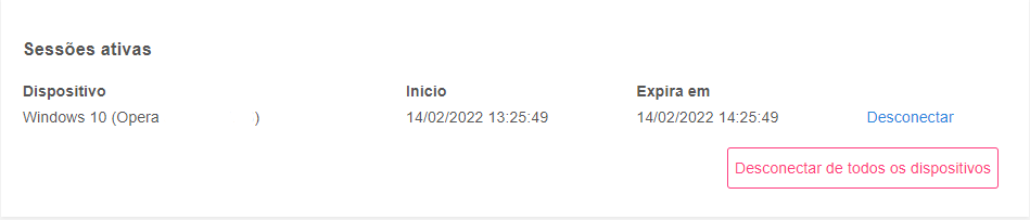 Aqui você encontra as informações de histórico de acesso à sua conta com as informações de data, dispositivo, início do acesso e quando expirou.