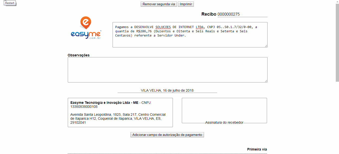 Já precisou emitir recibo para alguém e não tinha um bloquinho de recibos ou precisou escrever tudo num arquivo de texto? Pensando em facilitar a vida dos nossos usuários, o Meu Dinheiro desenvolveu a própria funcionalidade de recibos. Os recibos são gerados a partir dos dados cadastrados no sistema, facilitando o preenchimento, e podem ser totalmente editados. Como no modelo abaixo: