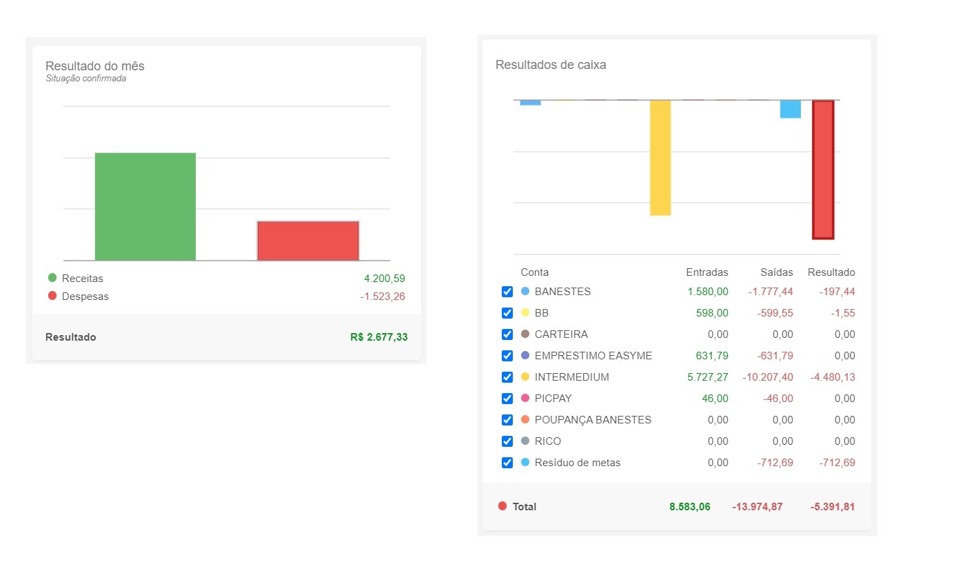 Já o painel de resultados do mês você pode utilizar para saber qual foi a diferença do total de lançamentos de receitas e despesas. Veja a diferença dos painéis abaixo: