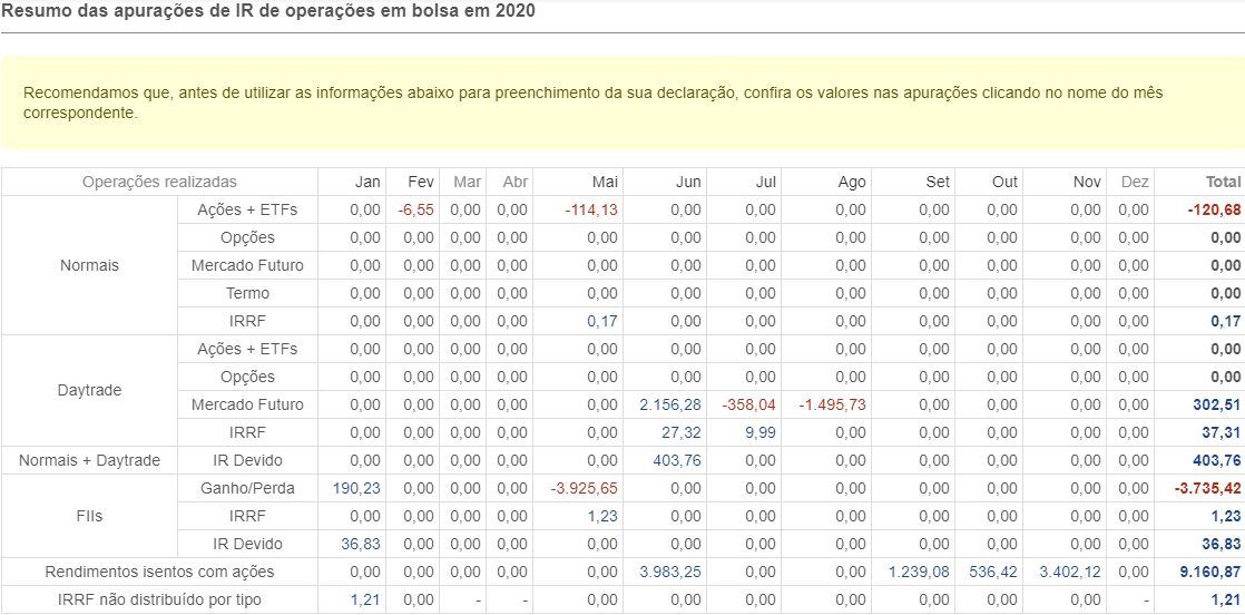 - MD-1192 Declaração anual IR - Segregar os rendimentos entre ações/ETF, opções ,mercado futuro e mercado a termo;