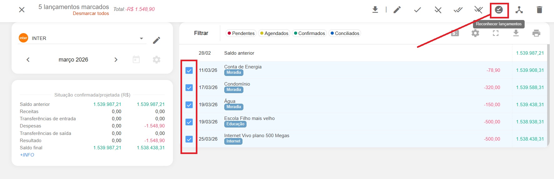 Disponibilizamos a função de reconhecimento de lançamentos em lote. Basta selecionar os lançamentos desejados clicando no ícone de status presente no início da linha do lançamento e clicar na opção de reconhecimento exibida no canto superior direito da tela.