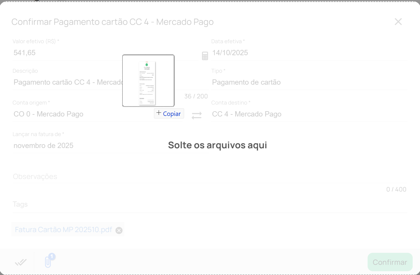 Alguém no último post do blog ou no grupo do Telegram sugeriu esta melhoria, muito boa por sinal. Agora é possível arrastar arquivos para tela de criação, edição e confirmação de lançamentos e o arquivo já fica anexado. Muito mais prático né!