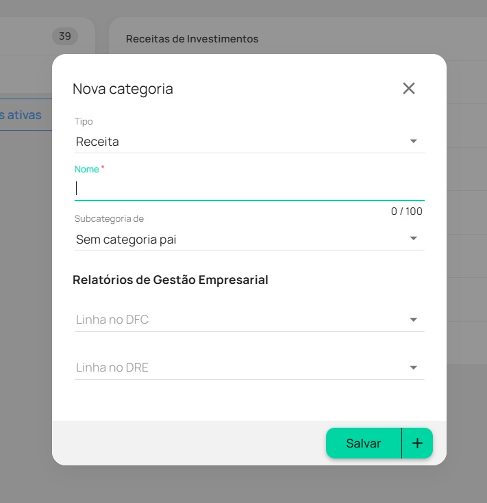 Importante: Antes da utilização destes relatórios, é necessário realizar a configuração deles, principalmente para a associação das categorias utilizadas no sistema com as linhas que compõe o relatório. Essa associação pode ser feita tanto no próprio relatório, passando o mouse sobre o nome da linha e clicando no ícone de engrenagem, quanto na tela de cadastro de categorias.