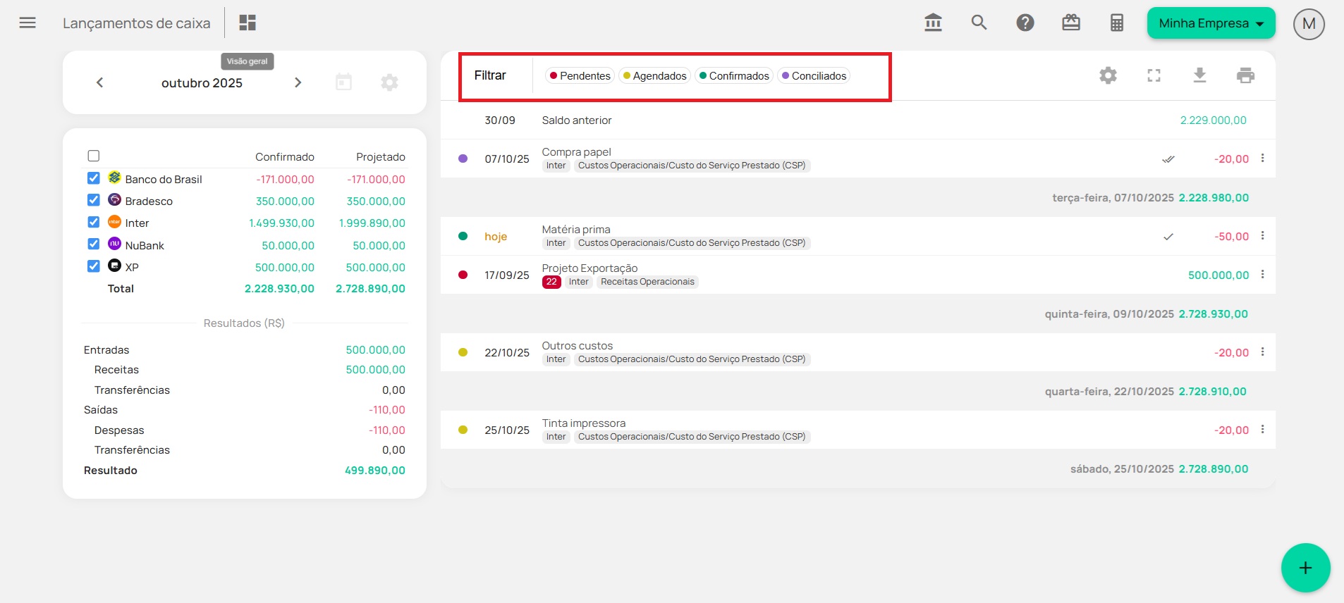 Conforme solicitado pelos usuários no grupo Telegram, alteramos a localização dos filtros de status de lançamentos. Também modificamos as cores padrão dos status para integrá-las à nova paleta de cores da interface. Lembre-se: Você pode personalizar essas e outras cores a qualquer momento na tela ‘Configurações de Utilização’ (acessível pelo menu principal).