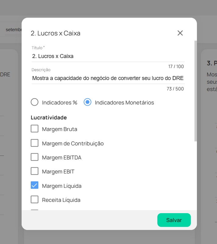 Com base nos relatórios de Balanço Patrimonial, DRE e DFC, o MD calcula os KPIs (Indicadores de Performance) mais importantes e fundamentais para a gestão de qualquer negócio. Vale destacar também que é possível editar e até mesmo criar um painel com indicadores de forma totalmente personalizada.