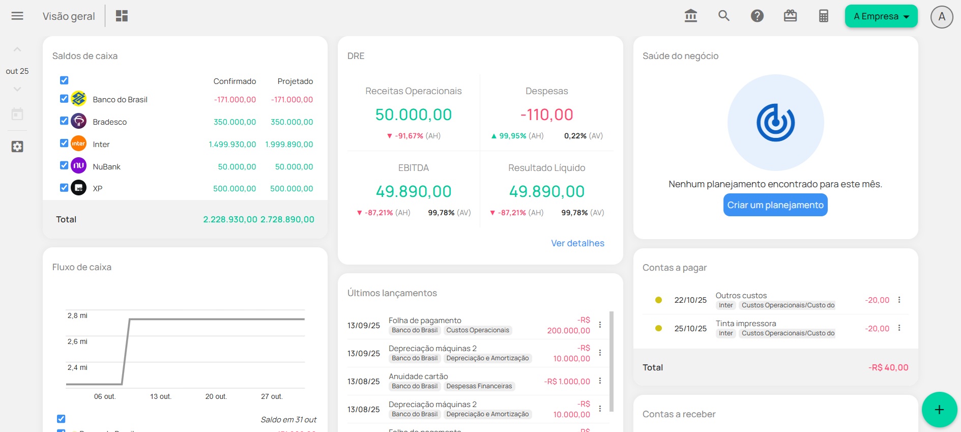 Para usuários da versão empresarial, disponibilizamos novos painéis na tela de Visão Geral. Agora é possível visualizar inclusive uma visão resumida do DRE.
