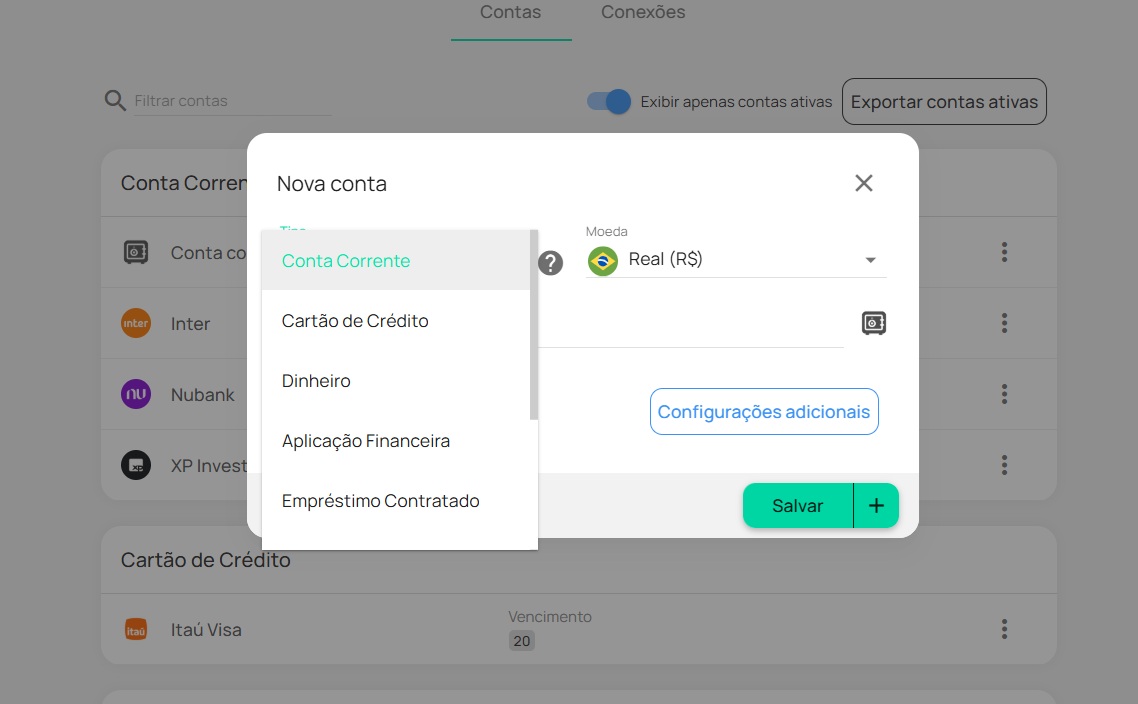 Agora é possível utilizar diversos novos tipos de contas, tanto na versão Pessoal quanto na versão Empresarial. Você pode conferir todos os tipos de contas disponíveis e suas finalidades no nosso manual.
