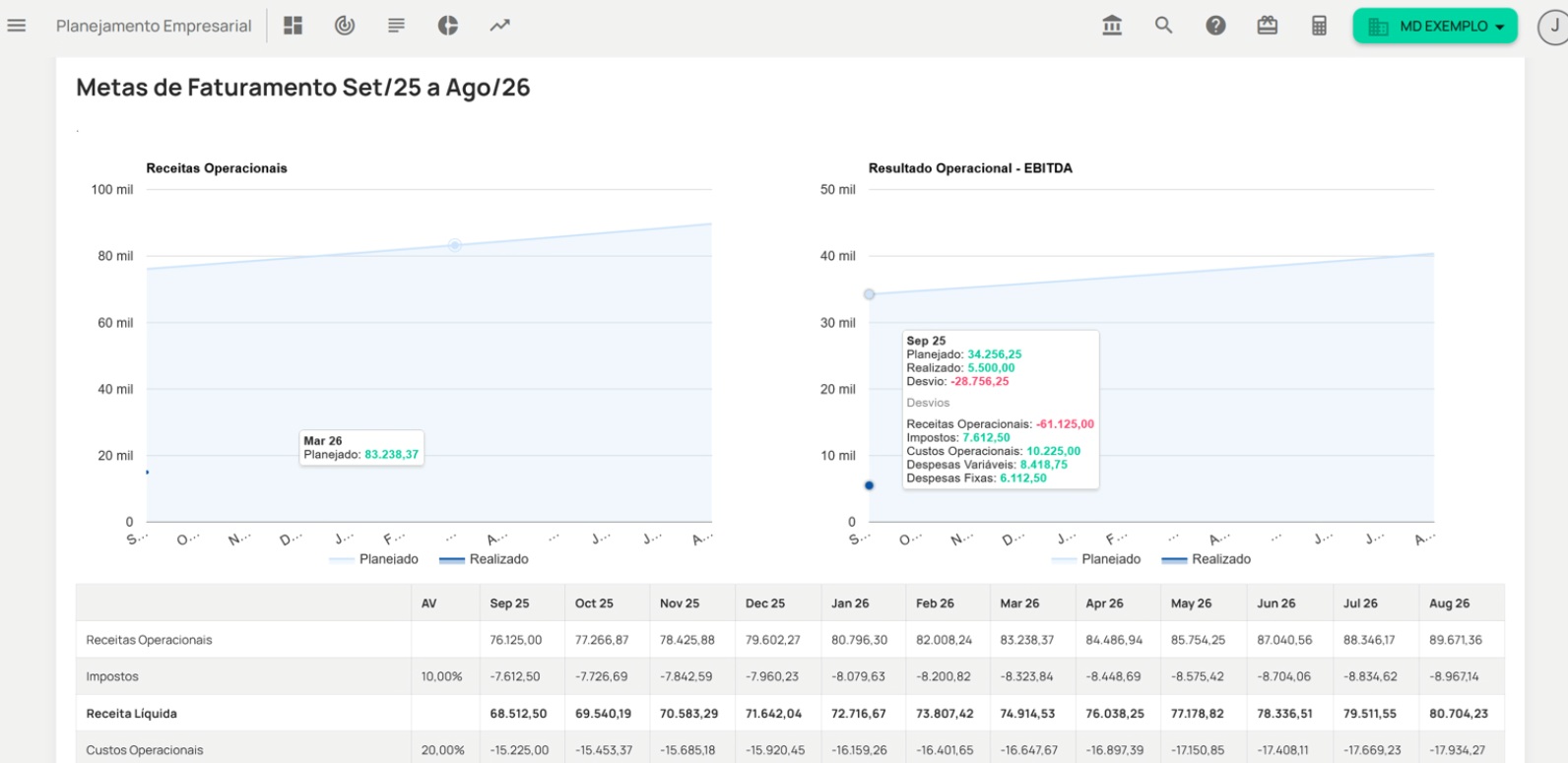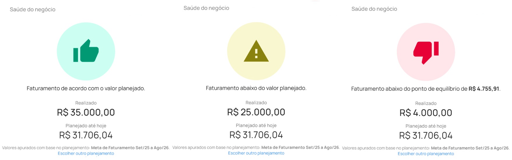 E não para por aí. A partir do Planejamento Empresarial o sistema projetará de forma dinâmica informações em um painel exclusivo na tela de Visão Geral com informações sobre a saúde do seu negócio