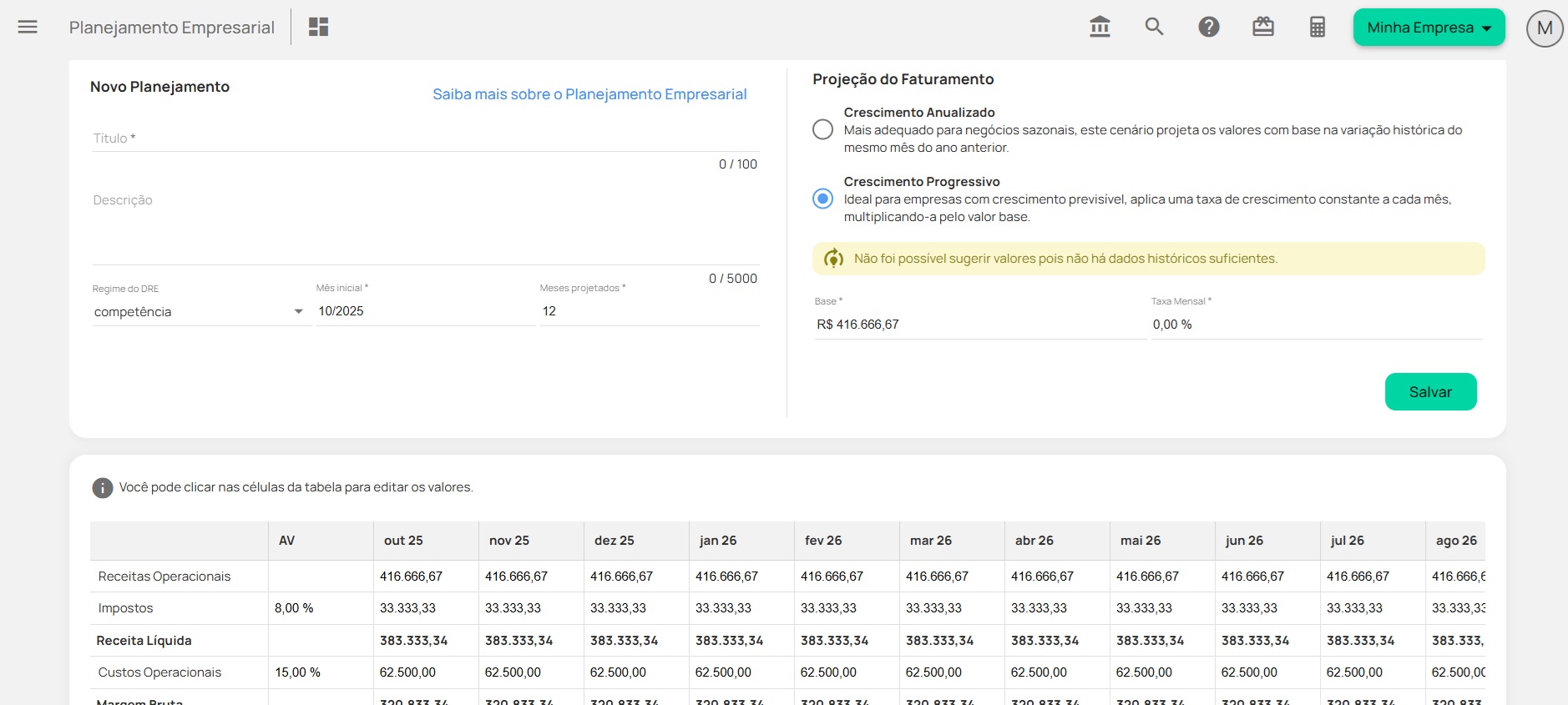As projeções financeiras combinam o poder dos seus dados históricos com a flexibilidade da inserção manual de informações, ideal para cenários onde o histórico é limitado ou insuficiente. Este recurso é a base de um Planejamento Empresarial robusto, fornecendo a visão completa de que você precisa para tomar decisões estratégicas com confiança.