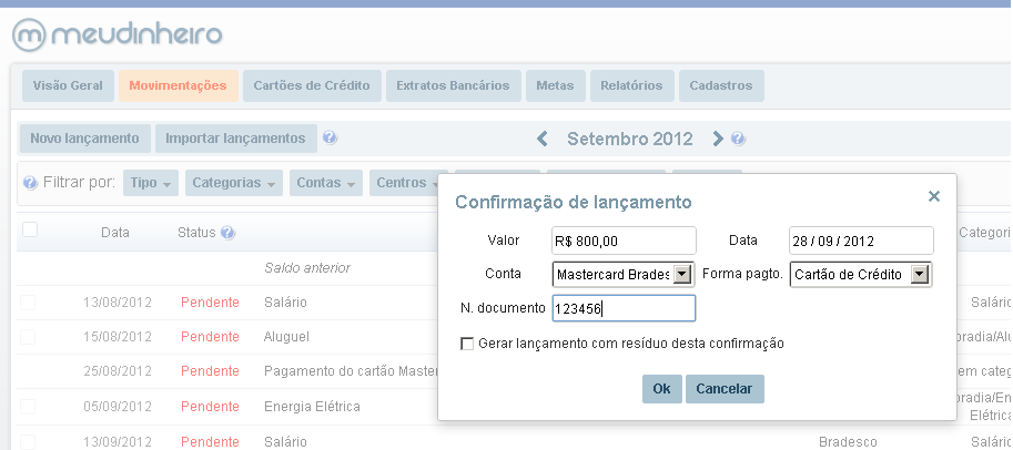 **Permite definir, no momento da confirmação/conciliação de um lançamento, uma nova conta (inclusive de cartão de crédito), forma de pagamento e número de documento.