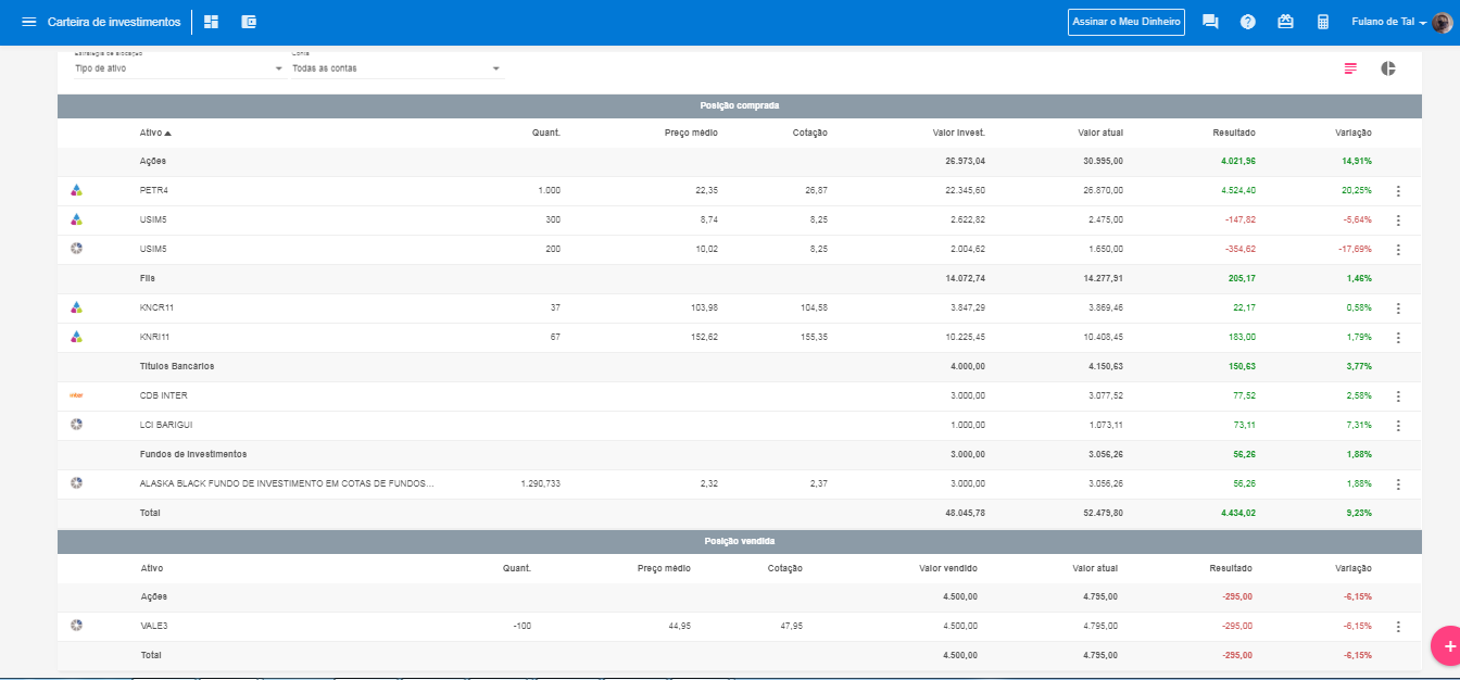- Divisão de posição comprada e vendida na nova tela de Carteira de Investimentos