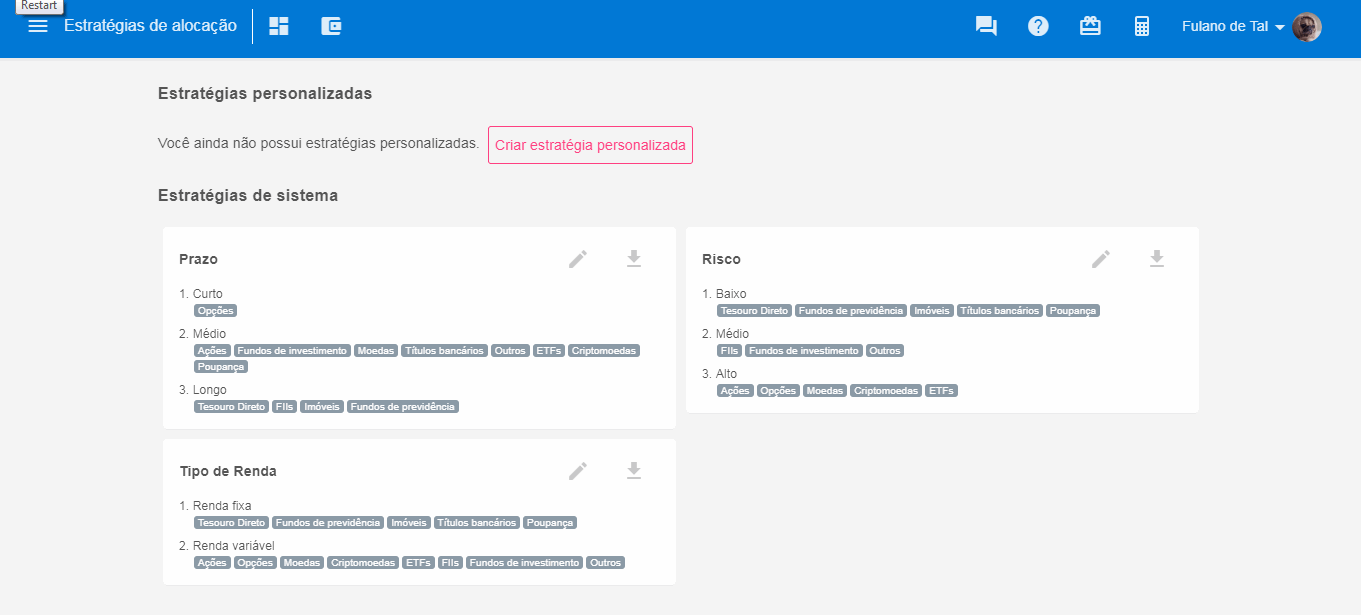 - Estratégias de alocação (Defina estratégias de Curto, Médio e Longo prazo, por tipo de ativo ou até mesmo por setor de alocação, exemplo alocação em ações por setor de atuação - Construção Civil, Financeiro, Petróleo e gás, Tecnologia, Mineração, Educacional, etc.)