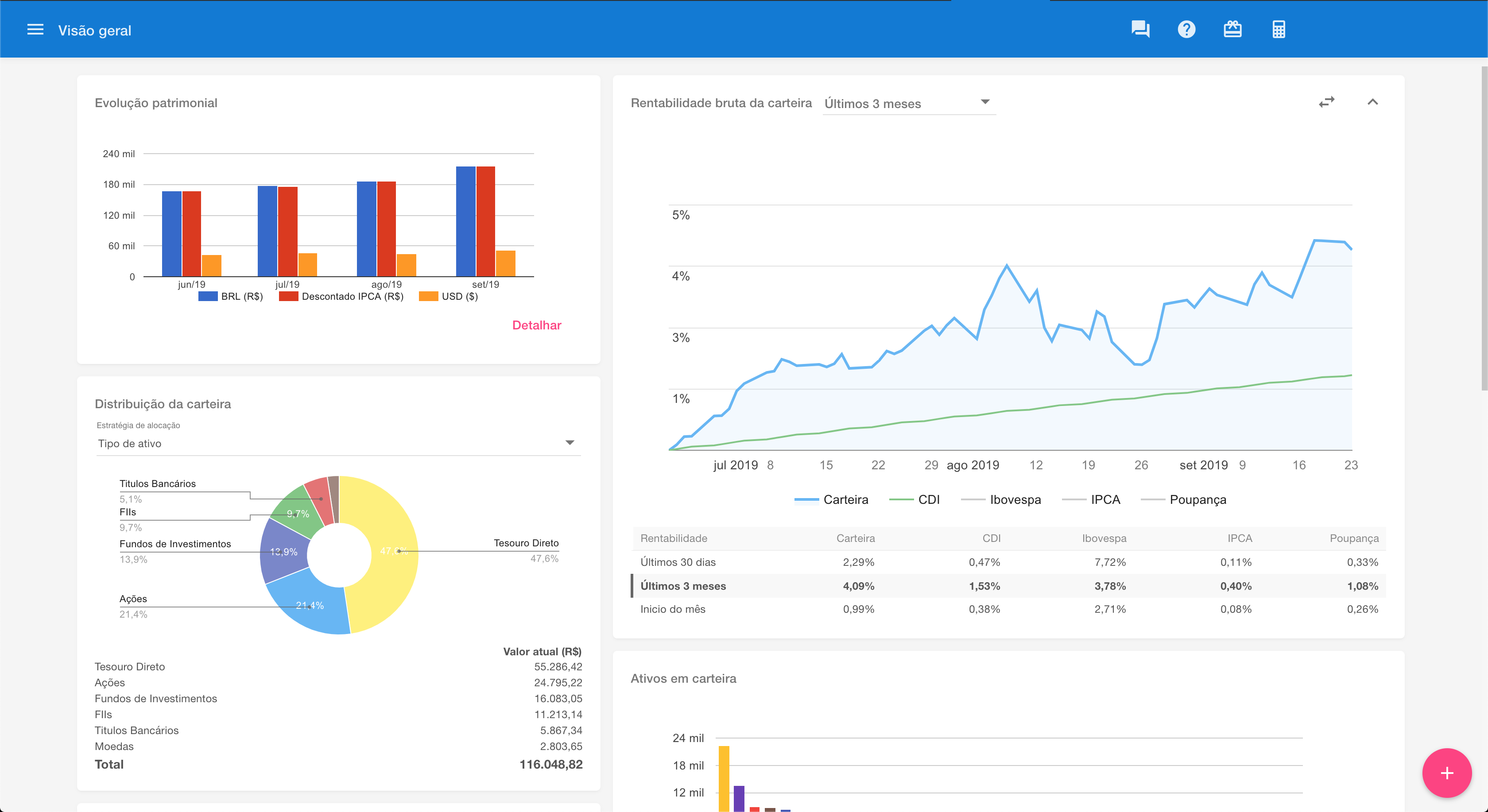 Agora temos uma Visão Geral de Investimentos, que é composta por duas colunas de painéis e que podem ser reposicionados ou ter a visualização desabilitada, de acordo com a preferência de cada usuário.