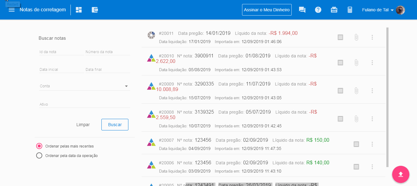 - Histórico de notas de corretagem importadas