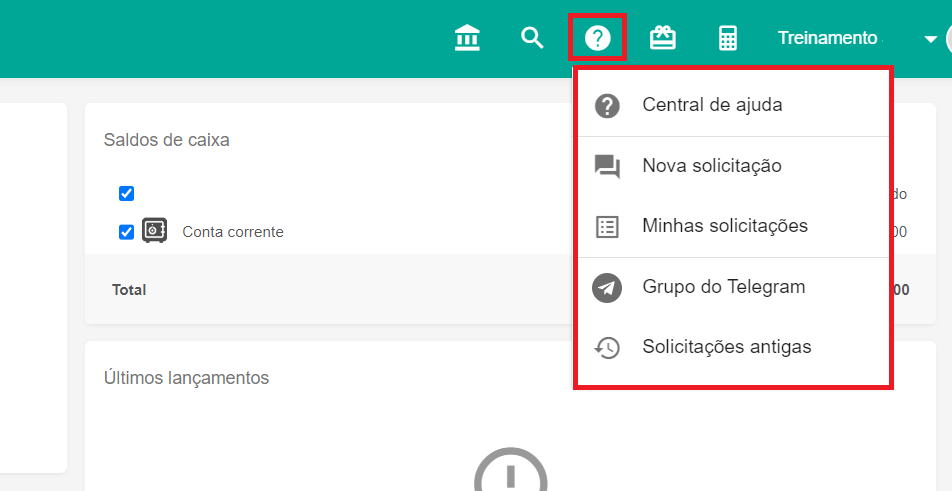 A partir de hoje, todos os novos tickets de atendimento serão criados através da nova ferramenta disponível. É importante ressaltar que os atendimentos antigos serão finalizados ainda pela plataforma antiga e poderão ser acessados através da opção “Solicitações Antigas”. Agora, ao clicar no ícone de interrogação no canto superior direito da tela do sistema, serão exibidas as opções conforme a imagem abaixo: